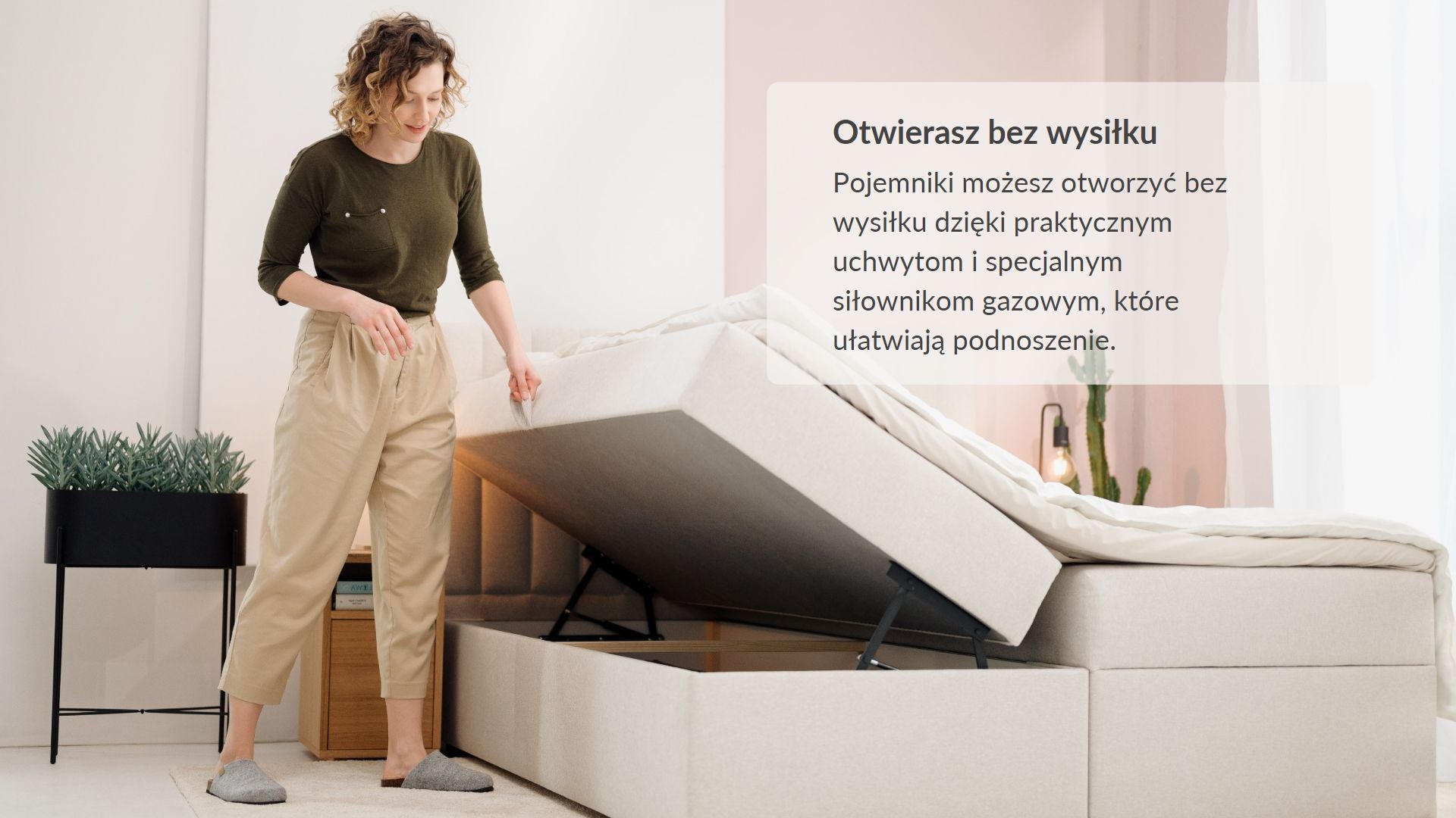Komfortowe łóżko kontynentalne z dużymi pojemnikami na pościel i wygodnym materacem. Wybierz wkład ze sprężynami bonellowymi lub kieszeniowymi i topper do kompletu.