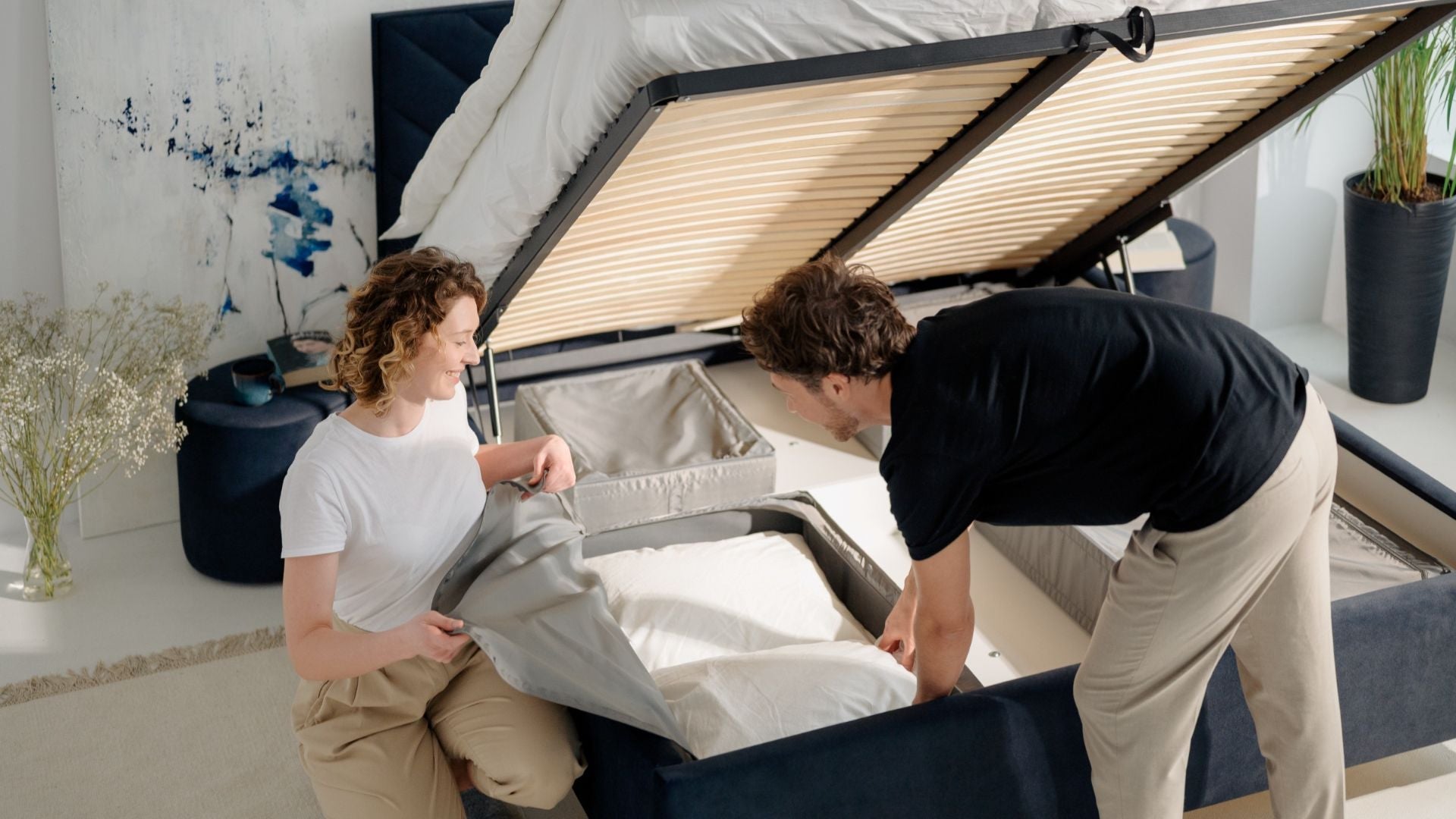 Dzięki sprężynom gazowym możesz wygodnie unosić ramę łóżka, pod którą znajduje się obszerny, wzmocniony pojemnik na pościel i nie tylko.