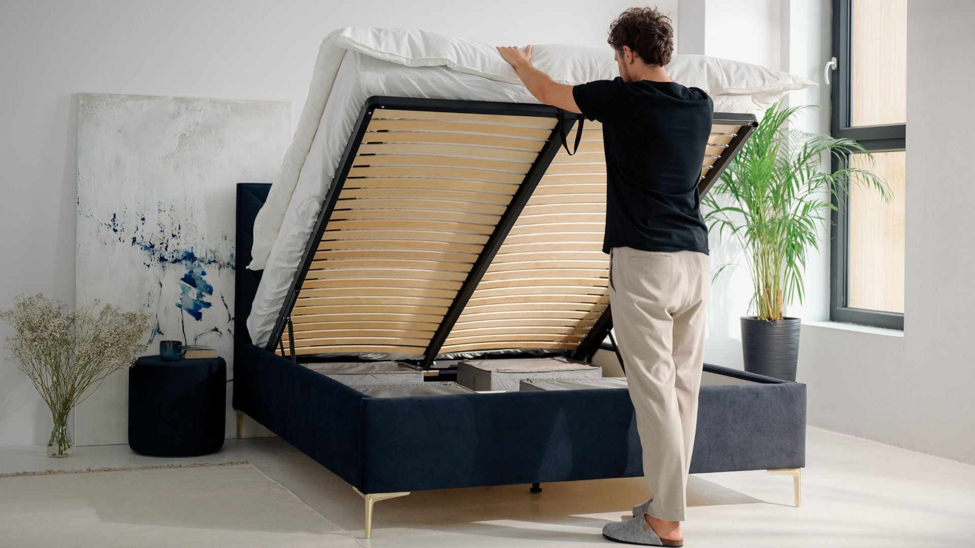 Dzięki sprężynom gazowym możesz wygodnie unosić ramę łóżka, pod którą znajduje się obszerny, wzmocniony pojemnik na pościel i nie tylko.