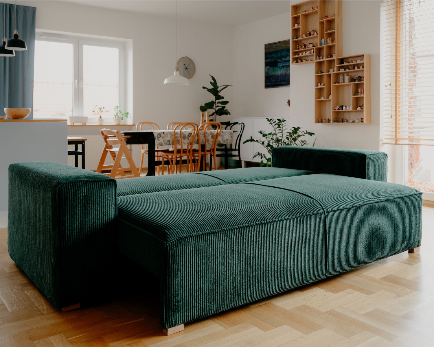 Sprawnie rozkładasz mebel w pełnowymiarowe, dwuosobowe łóżko i równie łatwo składasz z powrotem, a pościel chowasz do sporego pojemnika.