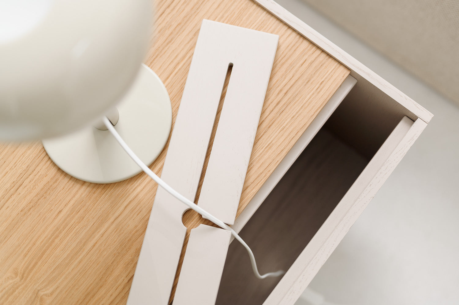 Rubick wyróżnia się tym, że posiada praktyczny ukryty schowek, do którego możesz włożyć np. listwę zasilającą i podpiąć lampkę nocną czy ładowarki. Wieko schowka ma specjalnie zaprojektowane otwory ułatwiające organizację przewodów, więc nie będą już nieestetycznie zwisać obok.
