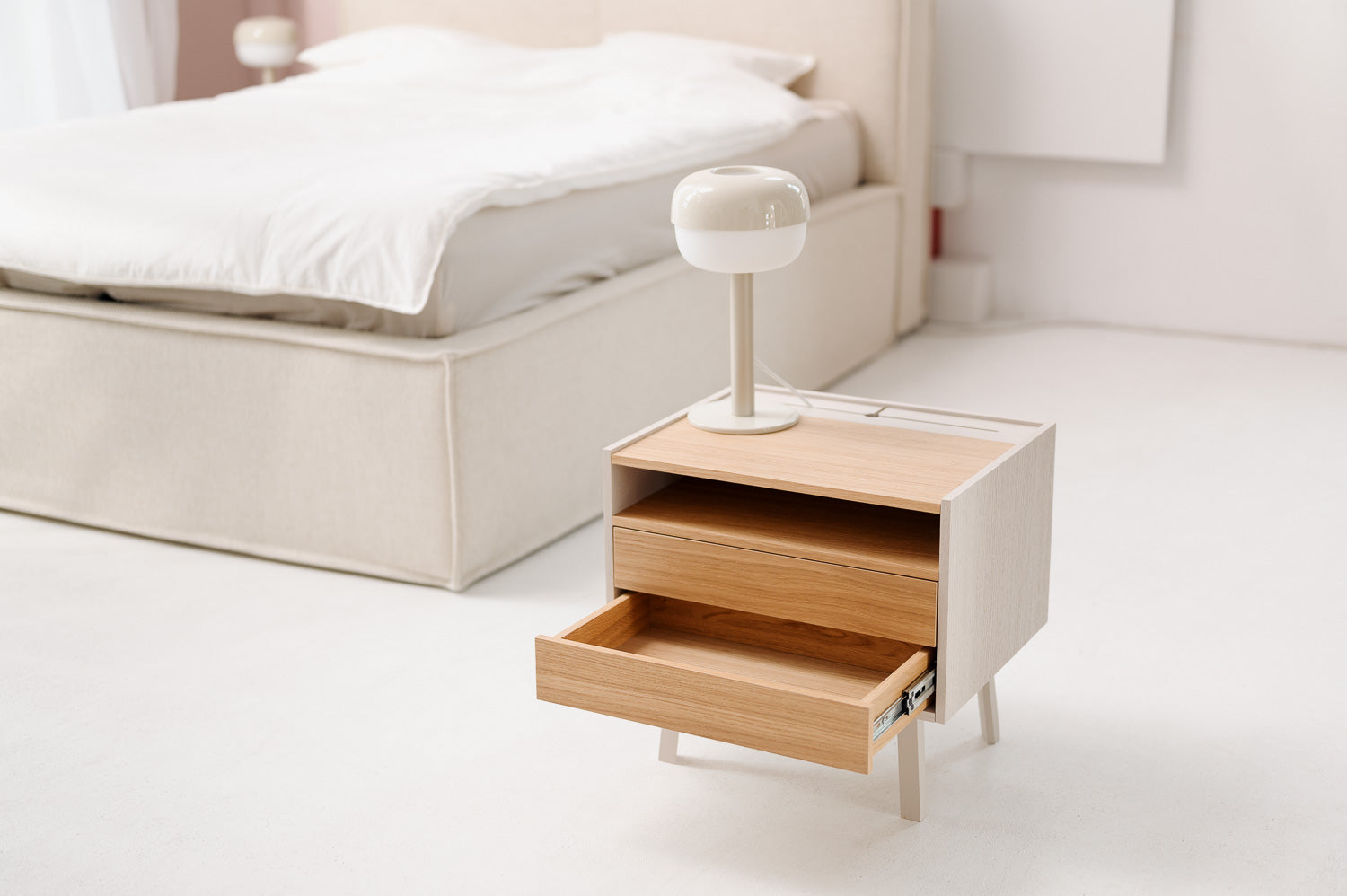 Dwie szuflady, półka i schowek. Zadbaliśmy o to, żeby nasze szafki były wystarczająco pojemne, by zmieścić wszystko, co potrzebujesz mieć pod ręką. Ulubiona książka, okulary, krem do rąk, opaska na oczy do spania, gumka do włosów — wrzuć każdą z tych rzeczy do środka i ciesz się porządkiem!